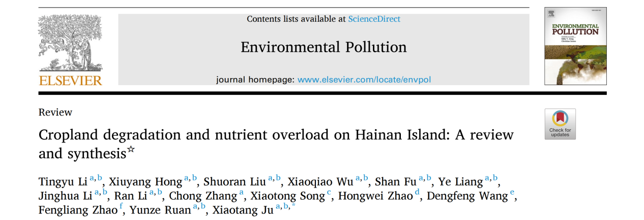 9月8日,环境科学类TOP期刊《Environmental Pollution》以402永利集团官网入口三亚南繁研究院为第一单位,热带耕地养分资源循环利用与质量保育团队李婷玉副研究员为第一作者,发表了题为“Cropland degradation and nutrient overload on Hainan Island: A review and synthesis”《海南岛农田退化与养分过量投入:综述与综合》的综述论文。