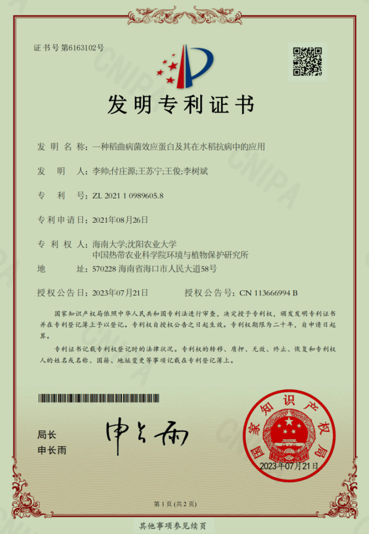 图12. “一种稻曲病菌效应蛋白及其在水稻抗病中的应用”发明专利授权证书