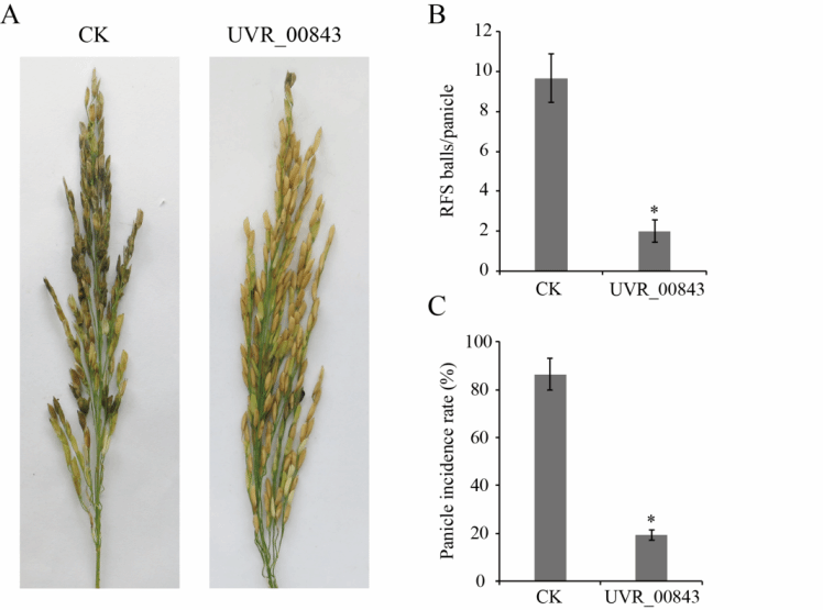 稻曲病又称伪黑穗病、绿黑穗病、谷花病、青粉病,俗称“丰产果”。该病只发生于水稻穗部,为害部分谷粒。受害谷粒内形成菌丝块渐膨大,内外颖裂开,露出淡黄色块状物,即孢子座,后包于内外颖两侧,呈黑绿色,初外包一层薄膜,后破裂,散生墨绿色粉末,即病菌的厚垣孢子,有的两侧生黑色扁平菌核,风吹雨打易脱落。现有的防止稻曲病发生的方法一般是人为避免病田留种,深耕翻埋菌核,发病时摘除并销毁病粒人共去除和避免方式,或者通过改进施肥技术的手段。但是这些方式既费时费力效果也差,难以控制稻曲病的发生,因此,寻求一种能从根源上防治稻曲病的方式十分重要。