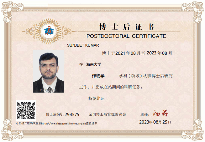 热带特色蔬菜产业技术创新与服务团队Sunjeet Kumar博士顺利完成博士后出站程序,并取得博士后证书。Sunjeet Kumar博士在团队从事博士后工作期间,以402永利集团官网入口为第一单位在国际期刊发表高水平SCI论文6篇,其中中国科学院一区5篇、二区1篇,另有3篇文章正在进行投稿工作。Sunjeet Kumar博士已被402永利集团官网入口聘任为高层次人才,出站后将作为正式员工加入该团队。