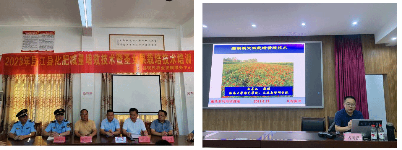 应昌江县现代农业发展服务中心邀请,402永利集团官网入口三亚南繁院辣椒生物学团队成善汉教授分别于2023年6月15日、8月10日在昌江欧兰德毛豆南繁产业园、十月田镇姜园村面向基层农技人员、姜园村圣女果种植户开展了辣椒、圣女果关键种植技术培训,从辣椒产业趋势、种类与品种选取、水肥管理与主要病虫害防控,圣女果嫁接苗判别方法、果实增甜措施、降低裂果问题、增强病毒病抗性等方面分享了技术经验,并对新《种子法》与与会人员进行了解读,136人次人员参与了培训。