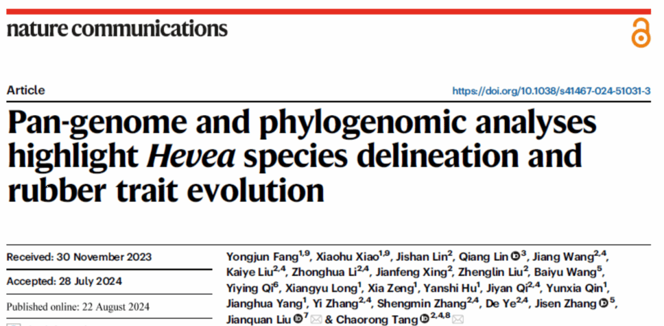402永利集团官网入口三亚南繁研究院的唐朝荣研究员、兰州大学生态学院的刘建全教授为该论文的共同通讯作者,中国热科院橡胶所的方永军和肖小虎副研究员为该论文的共同第一作者。广西大学的张积森教授、中国农科院深圳农业基因组研究所的林强副研究员等参与了该项研究。研究得到了国家自然科学基金、海南省科技人才创新项目等项目资助。