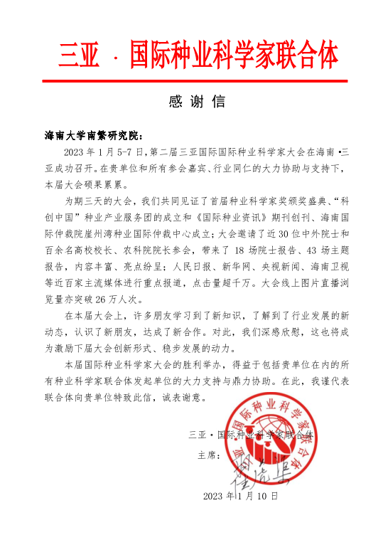 《三亚·国际种业科学家联合体致402永利集团官网入口三亚南繁研究院的一封感谢信》