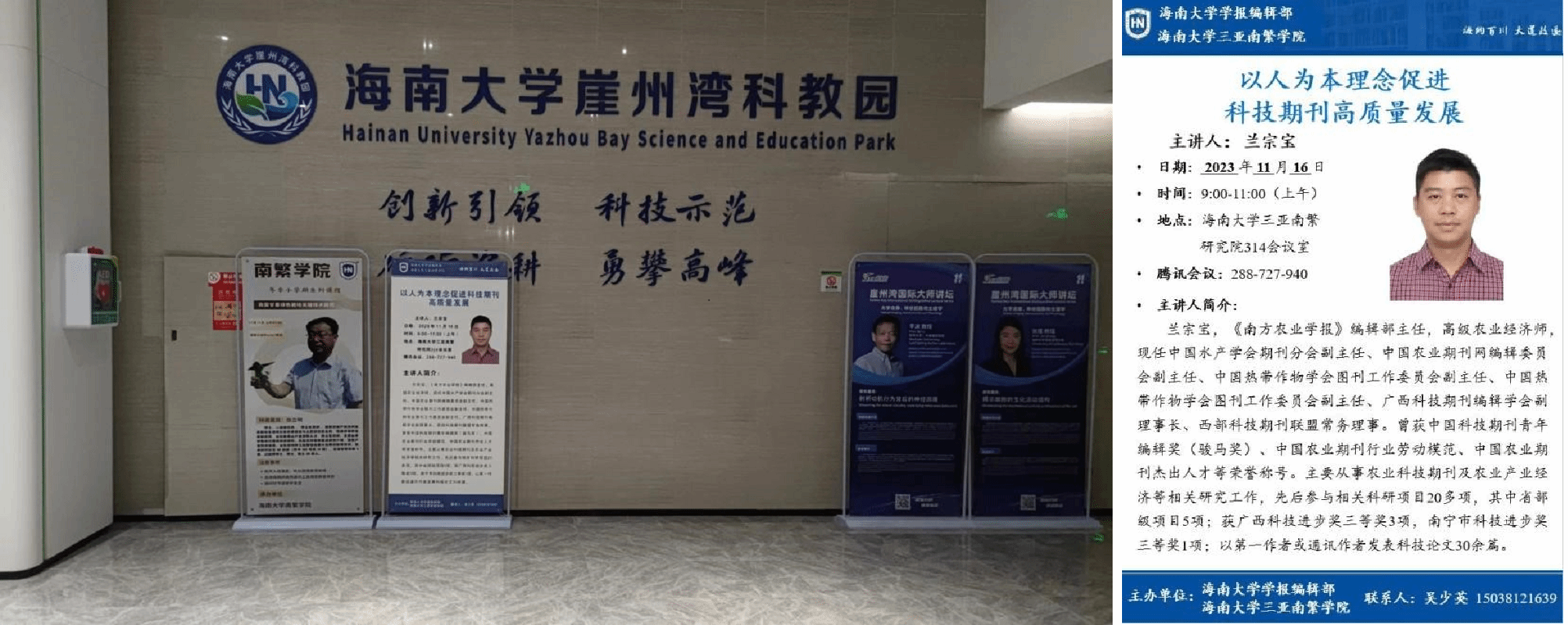 2023年11月16日上午,402永利集团官网入口学报编辑部和海大南繁研究院诚邀《南方农业学报》编辑部主任兰宗宝在402永利集团官网入口三亚南繁学院众创中心314会议室作报告,探讨“以人为本理念促进科技期刊高质量发展”,取得良好效果。