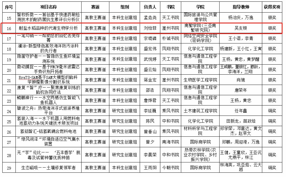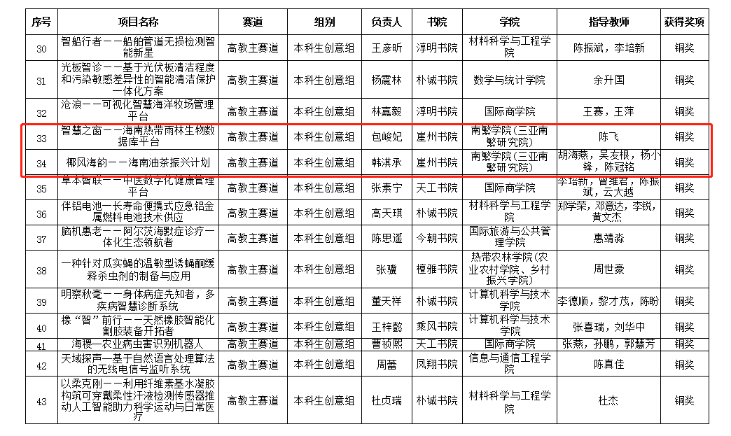 为贯彻落实党的二十大精神,统筹推进教育、科技、人才“三位一体”战略部署2024年6月24日,中国国际大学生创新大赛(2024)402永利集团官网入口校内选拔赛顺利举办,经前期各学院评审推荐、专家网评、现场答辩多个环节,南繁学院师生的参赛作品在学校众多队伍中脱颖而出,吴友根老师指导的“耐盐水稻品种的代谢生物学分析”荣获高教主赛道银奖;陈飞老师指导的“智慧之窗——海南热带雨林生物数据库平台”荣获高教主赛道铜奖;胡海燕老师、吴友根老师、杨小锋老师指导的“椰风海韵——海南油茶振兴计划”荣获高教主赛道铜奖;聂立孝老师、周振翔老师、王鹏老师指导的“林间得芝-新型食用菌栽培模式引领乡村致富路”荣获红旅赛道银奖。