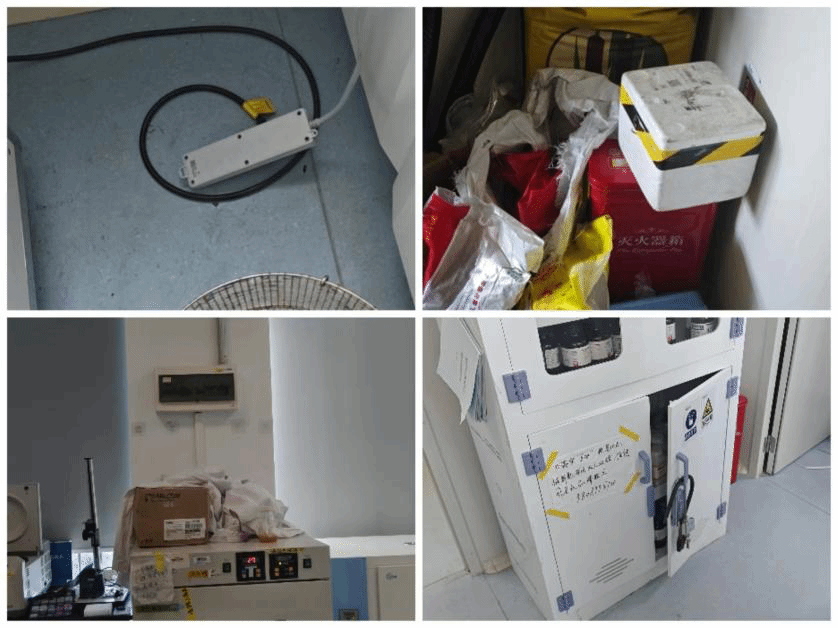对检查中发现的堆放杂物,用电安全及化学品管理不规范等问题,及时向现场师生反馈并形成台账要求整改。对于假期有实验安排的实验室,要求开展实验的师生严格遵守各项操作规程,安排值班人员,确保消除各类安全隐患。