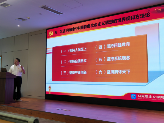 段捷频同志从习近平新时代中国特色社会主义思想的创立、主要内容、理论品格、历史地位和实践成果等五个方面为我院师生做了浅入深出的讲解。